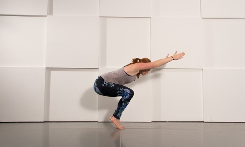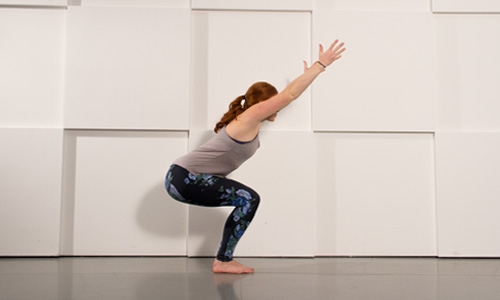 Chair pose is a great way to work your quads. Bring your big toes to touch, slightly separate your heels, and keep your knees behind your toes as you sit your hips back as far as you can. Hold for 3–5 breath cycles and gradually build up your time.
