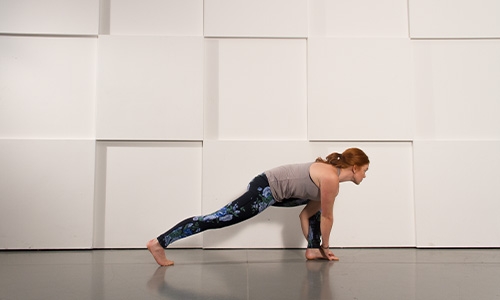 Lift your back heel, pull your gaze up, and drop low into this lunge variation. As your balance increases, shift your weight farther forward on your back foot, so just your toes have contact with the ground. You can even add a twist for another variation.
