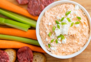 This spicy, creamy dip is a real crowd pleaser. Loaded with cheese, chicken, and a spicy hot sauce, it’s the perfect combination of flavors. I love eating it with some of the cooler veggies, like cucumber or celery.