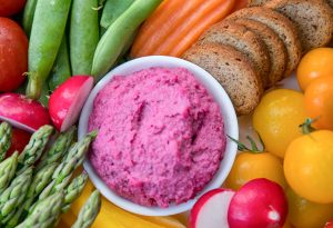 With its bright magenta coloring, this hummus dip makes a big impression. It’s just as yummy as it is beautiful, and it’s a vegan option that everyone will love! Young and old alike will love dunking their veggies in this bright, pink dip.