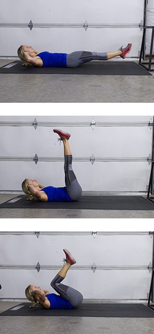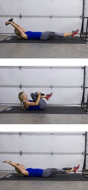 How to: Begin on your back, hands behind your head and feet about six inches off the floor. Raise your legs to point towards the ceiling, then crunch your knees to your chest. Straighten them back out, then slowly lower your back to the starting position for one rep.