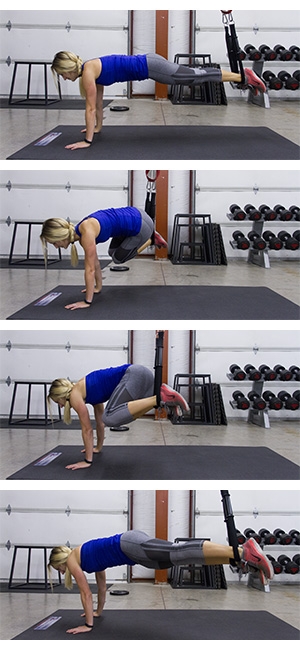 How to: Lengthen the cables to hit just below your knee. Sit, facing towards them. Place your right foot in the left strap and left foot in the right strap (feet should be crossed), then twist around, pushing up into plank position (this will uncross the straps). Draw a large circle with your feet. Alternate directions at the bottom of each circle.