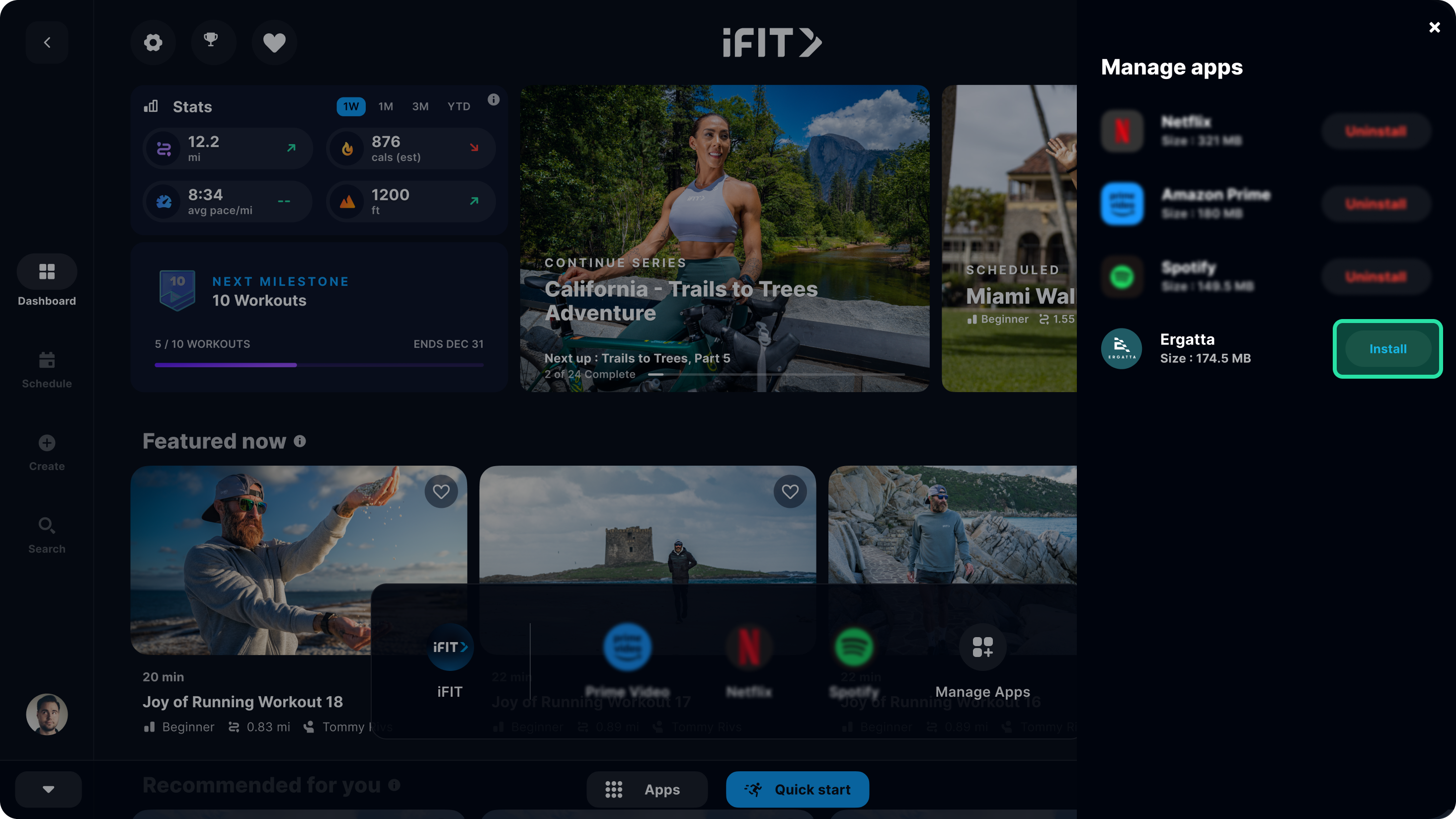 Select “Manage Apps,” find Ergatta Races, and tap “Install” to begin downloading. Note: If your machine is low on storage, you may need to uninstall other apps to install Ergatta.
