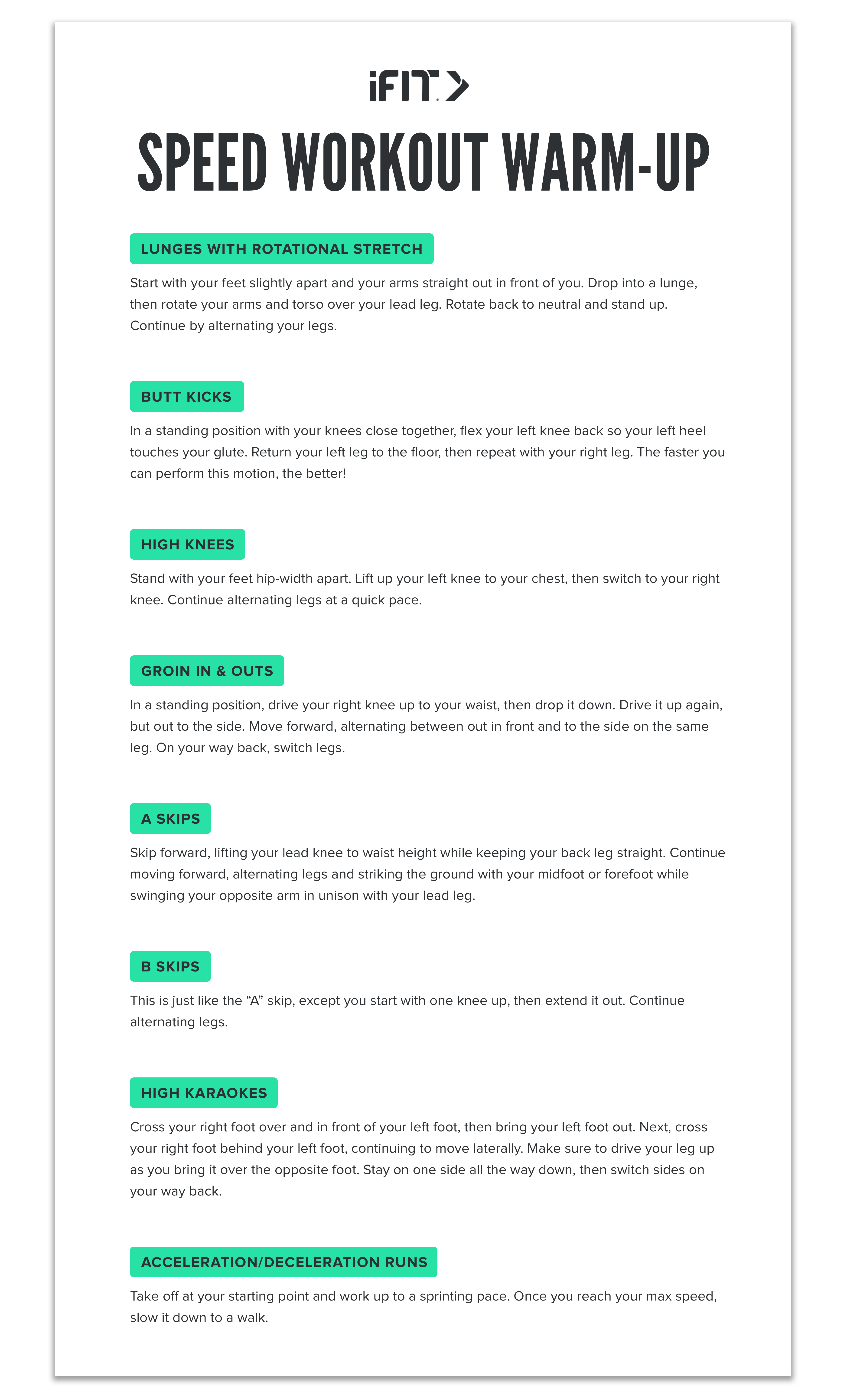 However, if you’re doing a speed run or a workout with quick, explosive movements, you’ll most likely want to do a “specific warmup.” A specific warmup just means you’ll perform movements that mimic the work about to be done, so your body is prepared for that movement pattern. Some of my favorites include acceleration/deceleration sprints, A and B skips, rotational lunges, butt kicks, high knees, and groin in/outs. This not only preps movement patterns that will be repeated within the workout, but they are multiplanar movements, too. They’ll improve your range of motion and teach your body proprioception, control, and posture. They also expose imbalances you might have, since most people are more coordinated on one side.