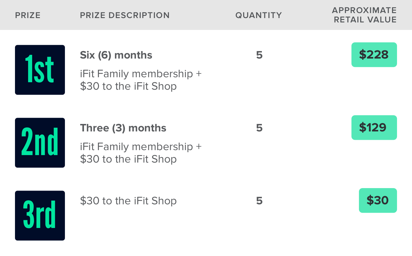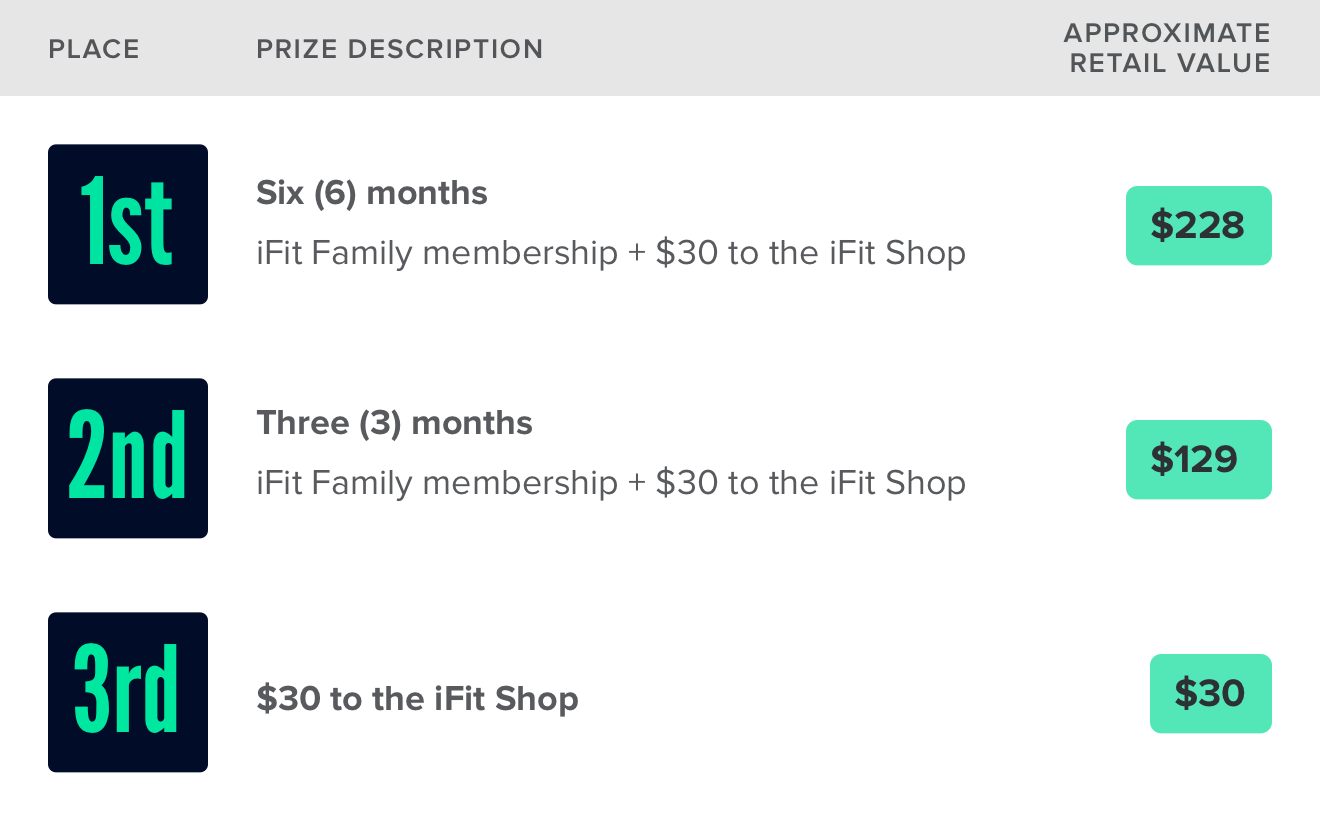 1st place winners: 6 months iFIT Family membership + $30 to the iFit Shop