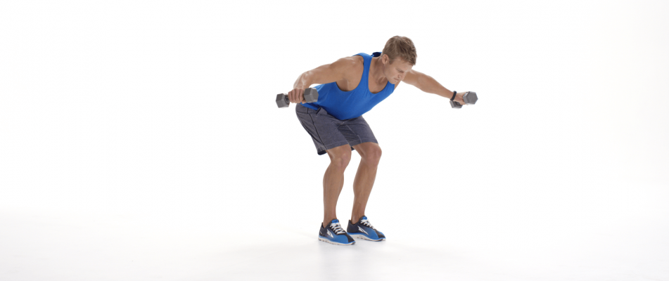 Reverse flyes are a great way to work your rear deltoids and help open up your posture. Start in a hinged position with your back flat, then, with a moderate-to-light dumbbell in each hand, lift your arms wide to form one straight line.