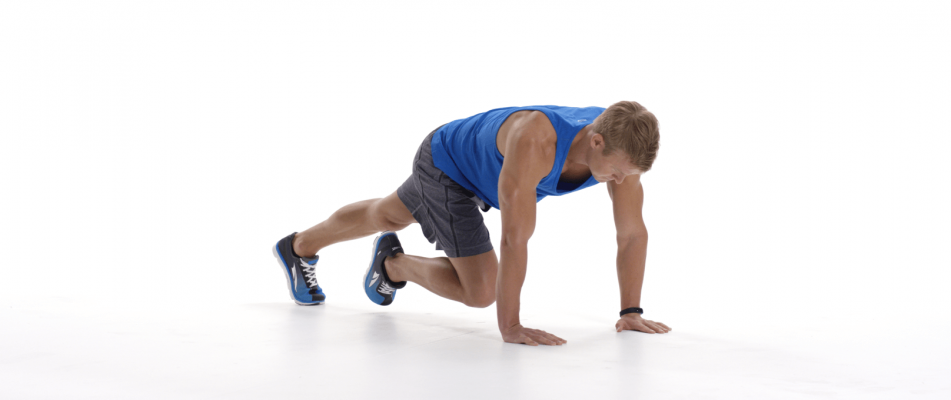 Knee-to-elbow plank is one of our favorite core exercises, because it assists in hip flexion and dynamic hip mobility. Start in a high-plank position, then pull one knee up to the same-side elbow while keeping your foot off of the ground. Hold for 10–30 seconds, then switch sides.