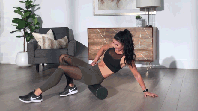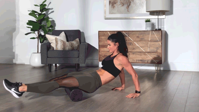 Place foam roller below the glutes (essentially, sit on the foam roller). Using your arms to support your body, slowly roll back and forth along the glutes. Keep in mind that your glutes may need extra attention, as they are a key muscle group for mobility, stability, and posture.