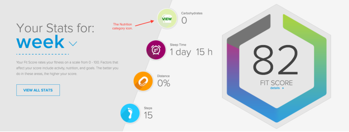 We’ve organized your stats into four categories: Nutrition, Sleep, Goals, and Activity. To view all of your stats within a category, just click the category icon.