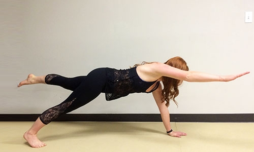 This pose is similar to knee to elbow, but now you’re going to focus on the obliques a little more. Try this pose back to back in a sequence with knee to elbow.