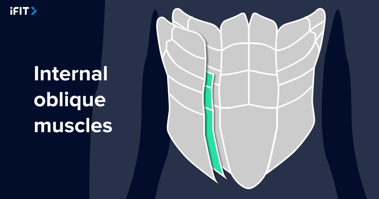 The internal oblique muscles4 are found on the lateral sides of the abdomen, beneath the external obliques. Like the transverse abdominis, the internal obliques help maintain abdominal pressure and trunk movement.